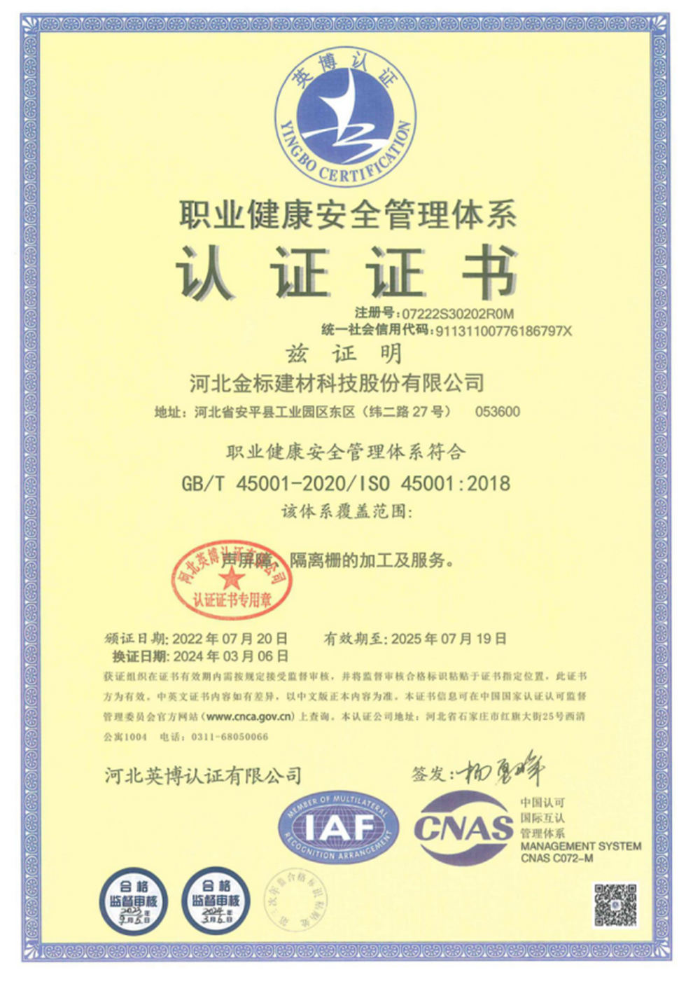 河北金標(biāo)建材科技股份有限公司成立于2005年,1998年開(kāi)始建廠生產(chǎn),是一家國(guó)內(nèi)較早從事交安材料的專業(yè)生產(chǎn)廠家之一;公司占地200萬(wàn)畝,擁有員工400余名,注冊(cè)資金6040萬(wàn), 已通過(guò)ISO9001質(zhì)量管理體系認(rèn)證,具備產(chǎn)品批量生產(chǎn)合格證、多項(xiàng)檢測(cè)報(bào)告等,先后獲得“AAA級(jí)信用企業(yè)”、河北優(yōu)秀企業(yè)”等殊榮。公司業(yè)務(wù)經(jīng)營(yíng)范圍包括高速公路、鐵路聲屏障生產(chǎn)基地;隔離柵,防護(hù)柵欄、刺鐵絲生產(chǎn)基地。